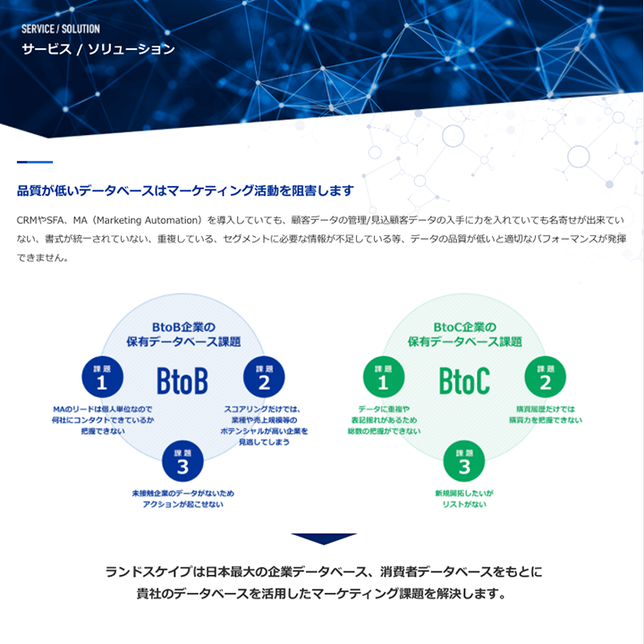 中堅・大手企業向けデータベースマーケティング支援事業独自構築した日本最大のデータベース(消費者9,500万件・企業情報820万拠点)を基にしたデータベースマーケティングの支援とCRM戦略立案を実施。